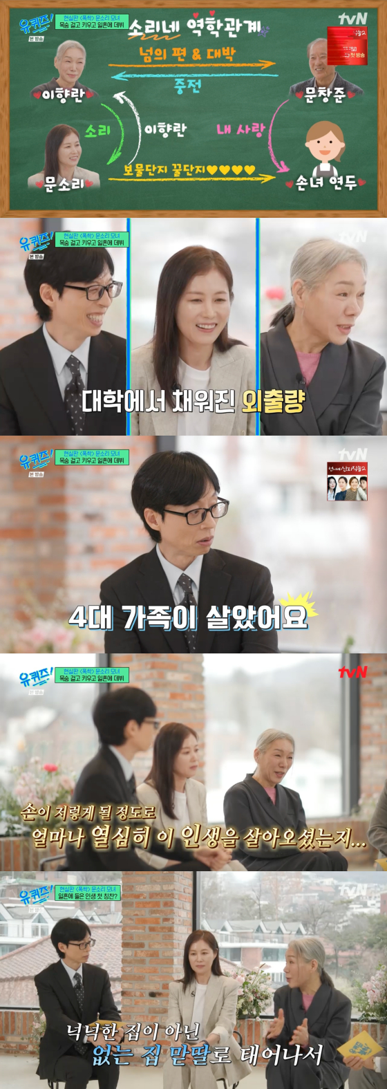 19일 방송된 tvN 예능 프로그램 '유 퀴즈 온 더 블럭'에는 26년 차 배우 문소리와 그의 어머니인 신인 배우 이향란이 출연했다.