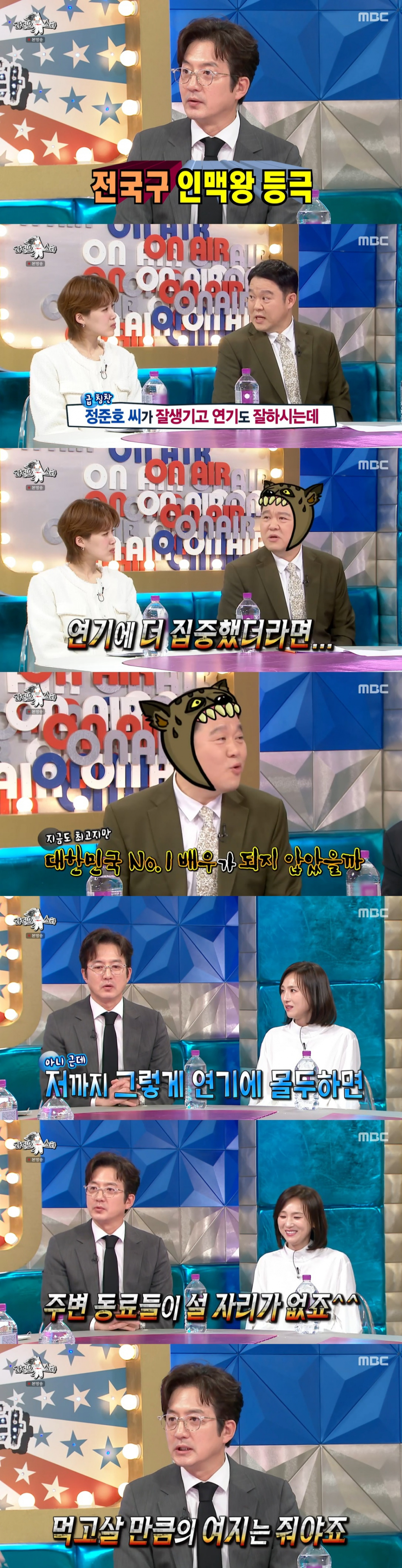 그러자 김구라는 "이런 말씀 드려서 쫌 그런데 정준호 씨가 워낙 잘생기시고 연기도 잘하시는데 주변에서 하는 말이 '이런 인맥 관리에 에너지를 쏟을 때 연기에 더 집중했더라면 대한민국 최고의 배우가 되지 않았을까'라는 이야기가 주변에 많다. 그런 이야기를 듣지 않냐. 사람들이 그런 얘기를 하지 않냐"라고 독설을 쏟았다.