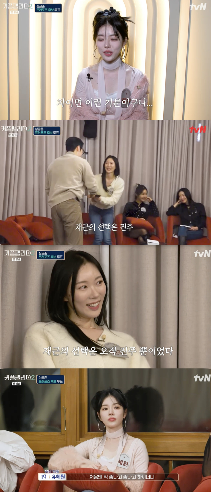 자신을 픽할 거라 예상했던 유혜원은 예상치 못한 황재근의 선택에 당황하며 "처음엔 막 좋다고 하시더니. 살면서 처음 겪어 본다. '아, 차이면 이런 기분이구나' (싶다)"라고 충격을 표했다.