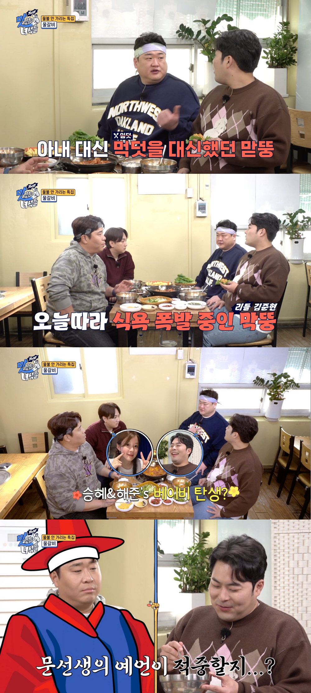 당황한 김해준에게 문세윤은 "(김)준현이 형도 옛날에 갑자기 엄청 먹었다. 촬영 그만하자고 할 때까지 먹었는데, 알고 보니 아내의 입덧을 대신 해준 것이었다"고 전한다.