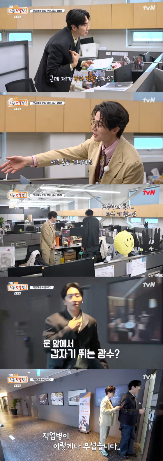 20일 방송된 tvN 예능 프로그램 '이혼보험: 직급 쟁탈전'에서는 이광수와 이동욱이 예능 부서로 이동하는 모습이 그려졌다.
