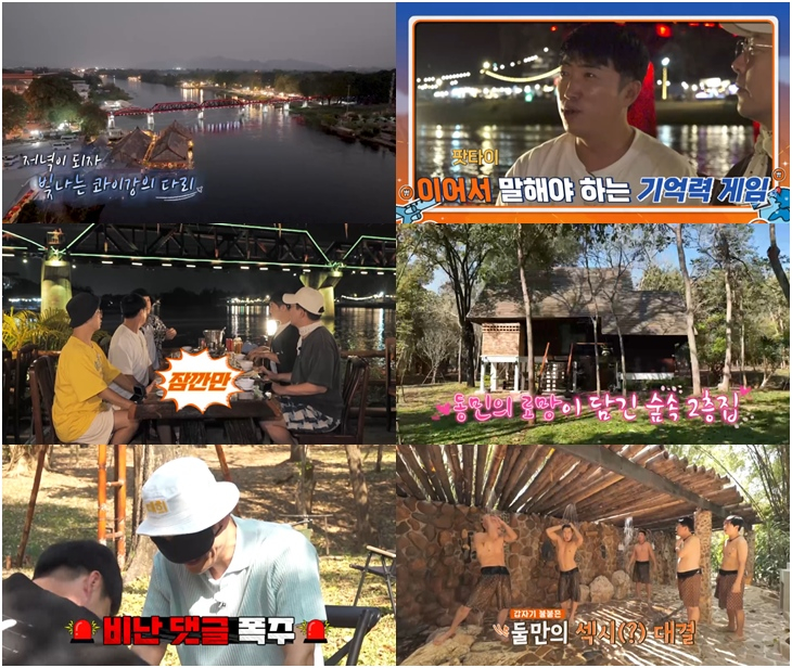 22일 오후 8시 20분 방송되는 채널S, SK브로드밴드, K·star, NXT '니돈내산 독박투어3' 30회에서는 태국으로 떠난 김대희, 김준호, 장동민, 유세윤, 홍인규가 '콰이강' 뷰를 품은 로컬 맛집에서 다양한 현지 음식을 맛보는 한편, 통나무 독채 숙소에서 환장의 독박 게임을 펼치는 모습이 공개된다.