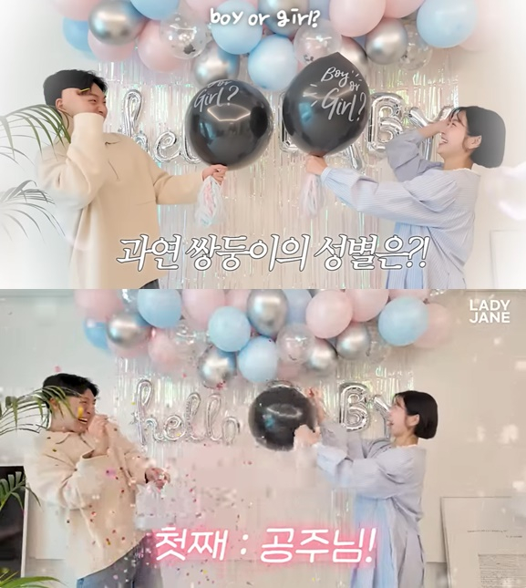 이어 두 사람은 각각 풍선을 하나씩 들고 터뜨려서 성별을 공개했다. 첫 풍선을 터뜨리자 핑크색 종이가 떨어지며 딸임이 공개됐고, 이어 두 번째도 딸이었다. 이에 두 사람은 자매 둥이의 부모가 된다고 밝혀 박수를 받았다.