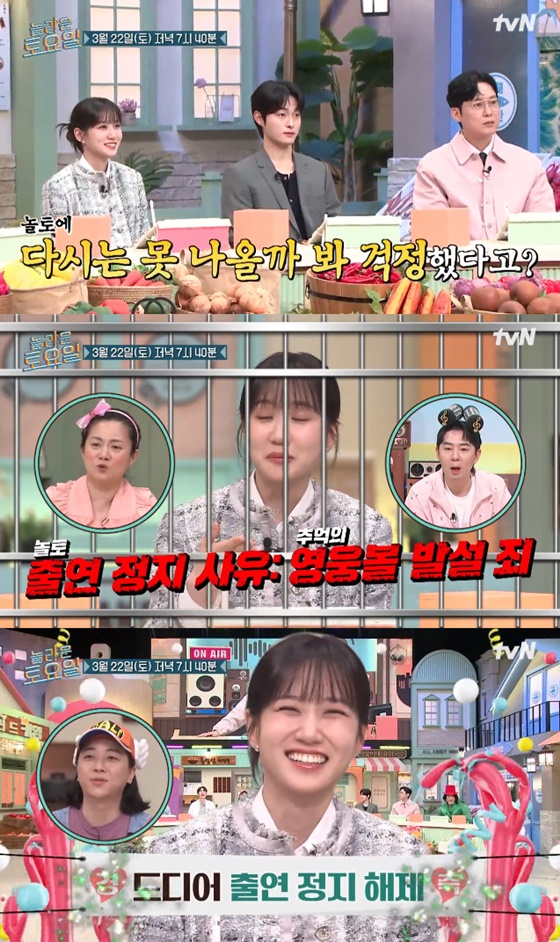 이날 방송에서 박은빈은 "'놀토'에 다신 못 나오는 줄 알았다. 제가 그때 영웅볼 글자를 말해버리는 바람에. 저한테 출연 정지라고 하지 않았나. 1년 반 만에 나왔다"고 말했다.