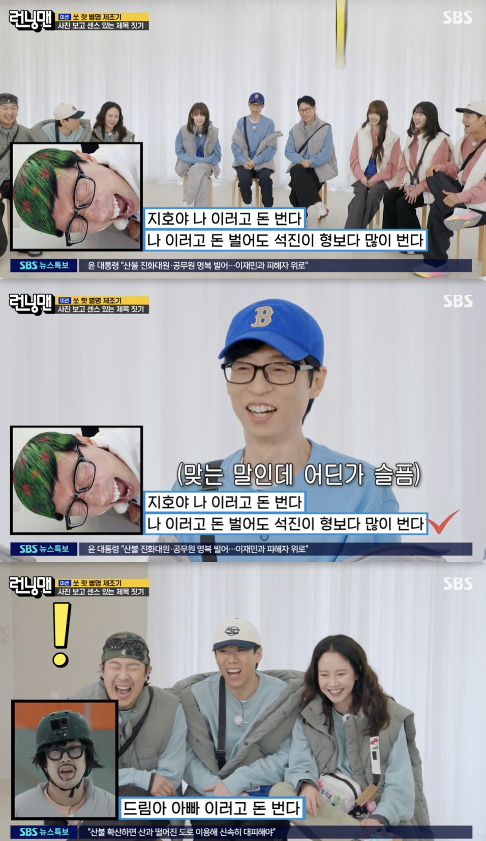 이어 유재석이 초록색으로 염색을 한 채 얼굴을 찡그린 표정의 사진이 공개됐다. 이를 본 지석진은 앞서 양세찬이 지은 제목을 응용해 "지호야 나 이러고 돈 번다"라고 비슷한 제목을 지어줬다.