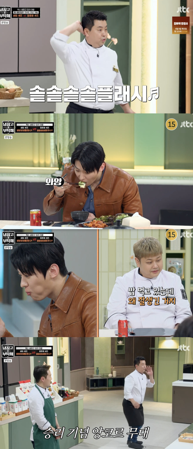 정호영은 승리에 기뻐하며 에스파의 '위플래쉬'를 솥밥 요리와 연결시켜 '솥플래쉬' 춤사위를 선보여 보는 이들의 웃음을 자아냈다.