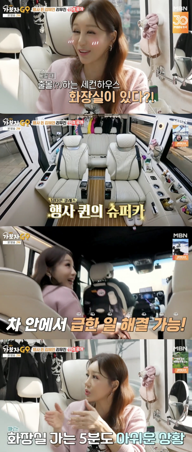 이날 김혜연은 MC 안정환과 홍현희를 한 달 살기가 가능할 정도의 초대형 리무진에 초대했다. 그는 "차에서 보낸 시간이 많다"라며 "'가보자GO'라는 프로그램이 집에 가는 거지 않냐. 제 차가 저의 세컨드하우스다"라고 리무진은 자신의 집과 다름없다고 소개했다.