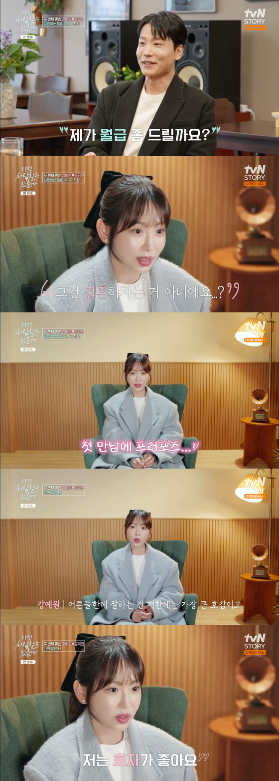 24일 방송된 tvN STORY 예능 프로그램 '이젠 사랑할 수 있을까'에서는 강예원이 두 번째 소개팅에 나서는 모습이 그려졌다.