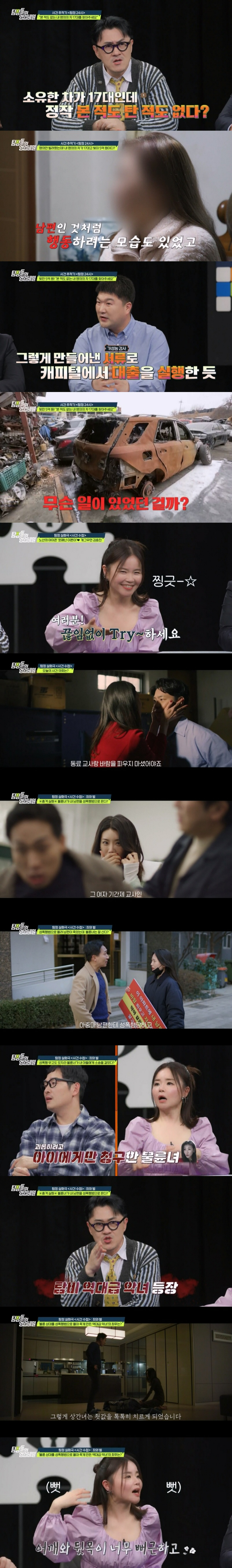 한편, 실화 재구성 코너 '사건 수첩-죄와 벌'에는 45세 나이에 자연 임신하며 화제를 모은 '쪼매난 이쁜이' 김효진이 게스트로 함께했다. 이번 실화 속 탐정 사무소를 찾아온 의뢰인은 교사 남편과의 사이에서 중증 자폐아 아들 하나를 두고 있었다. 자폐아 아들의 육아로 부부 모두 지쳐가던 중, 의뢰인은 남편이 바람을 피우고 있다는 사실을 알아챘다. 의뢰인은 가정을 생각하며 모른 척 참으려 했지만, 남편과 같이 근무하는 교사 동료인 상간녀는 아내를 계속해서 도발했다. 결국 아내는 이혼을 결심하고 증거를 찾아달라며 탐정에게 의뢰했다.
