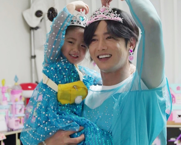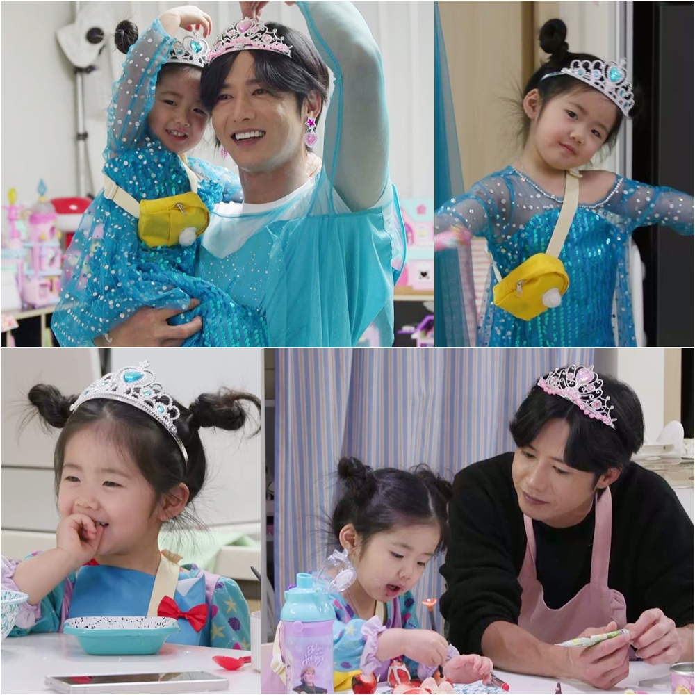 이날 방송에서는 오종혁의 역대급 '딸 사랑'이 펼쳐진다. 공주에 푹 빠져있는 로지를 위해 해병대 출신의 '강철 아빠' 오종혁이 과감히 왕비로 변신한 것. 공개된 스틸 속 오종혁은 로지와 똑같은 파란색 쉬폰 드레스와 화려한 왕관까지 장착한 모습으로, 우아한 종혁 왕비와 깜찍한 로지 공주의 모습이 유쾌한 부녀 케미를 발산해 시선을 사로잡는다. 특히 오종혁은 넓은 어깨로 인해 드레스가 잠기지 않는 반전 뒤태로 웃음을 선사했다는 후문.