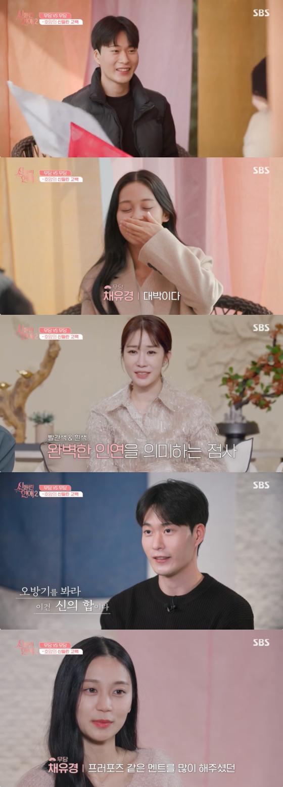 쌍방 그린 라이트를 켠 무당 장호암과 무당 채유경도 점사를 봤다. 장호암은 채유경과의 합을 보며 "유경 씨는 당당하고 솔직한 거 좋아하니까"라며 "나 솔직하고 당당하다. 유경 씨 마음 헷갈리게 하지 않을 거고 유경 씨한테 눈이 가고 같이 있고 싶다. 유경 씨 앞에 있을 때 가장 긴장되고 심장이 쿵쾅거린다"고 자신의 마음을 고백했다.