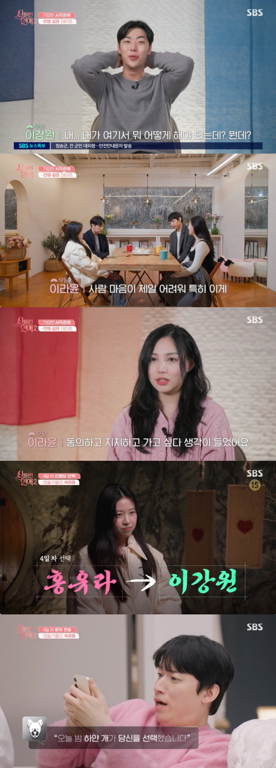 예상치 못한 질문에 당황한 이라윤은 "나는 (이강원한테) 관심이 있었던 것도 맞고 직설적으로 했던 것도 맞다. 분명히 서로 표시가 났다고 생각했는데 (이강원이) 그걸 이어갈 생각이 없다면 끌고 갈 생각은 없다"고 답했다.