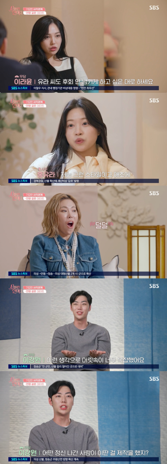 홍유라 역시 "호감 가는 사람이 있다. 일단 지켜보는 중"이라고 말하면서도 제대로 털어놓지 못하자 이라윤은 "유라 씨도 후회 안 남기게 하고 싶은 대로 해라"라고 싸늘하게 말했다.