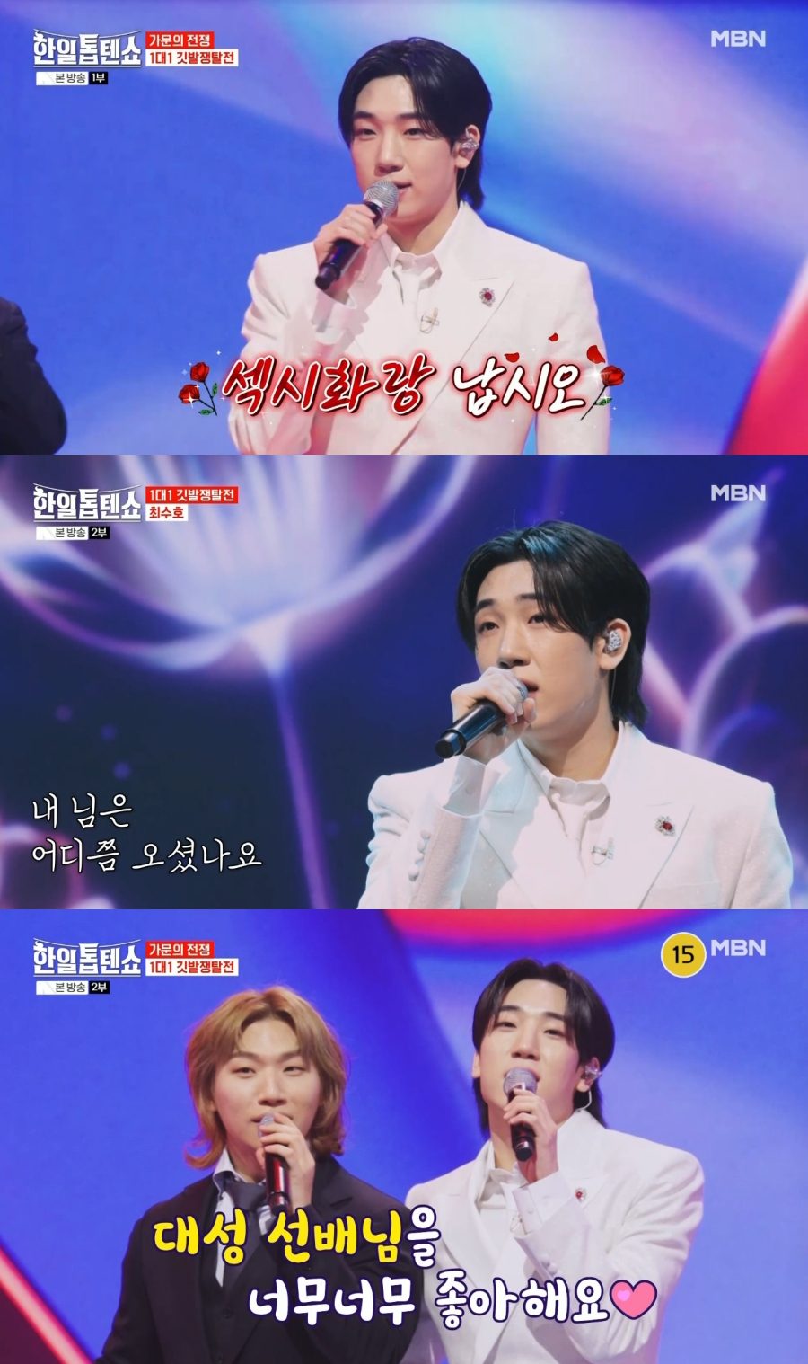 이어진 스페셜 유닛 대결에서 최수호는 신승태와 팀을 이뤄 소명의 '빠이 빠이야' 무대를 선보였다. 빠져들 수밖에 없는 가창력과 환상의 하모니로 감탄을 자아낸 두 사람은 곡 중간중간 관객들의 흥을 더욱 끌어올리는 안무까지 더해 신명 나는 무대를 완성했다.