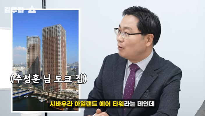 격투기선수 추성훈은 최근 야노시호, 추사랑과 사는 도쿄의 대저택을 공개해 화제가 됐다. 전문가는 "요즘 유튜브를 보니 추성훈 씨가 날아다니더라. 그분 사는 데가 미나토구로 우리나라의 강남 같은 곳이다. 추성훈 씨 집이 한 50억 정도다. 시바우라 아일랜드 에어 타워라는 곳인데 뷰가 나오는 아자부다이 힐스급은 아니고, 초일류는 아닌데 잠실 한강뷰가 나오는 대형 아파트다"라고 설명했다.