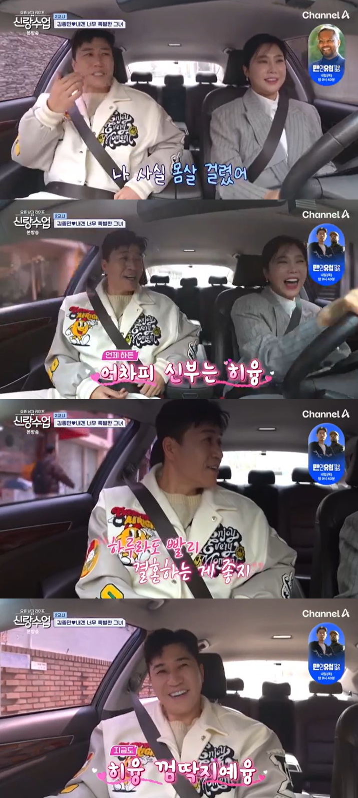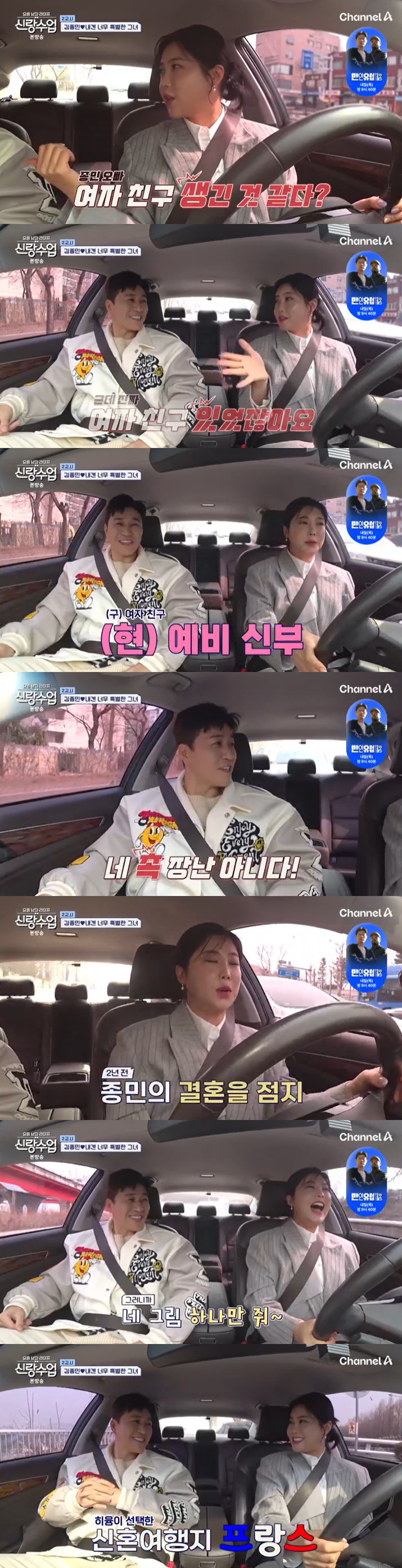 26일 방송된 채널A '요즘 남자 라이프-신랑수업'(이하 '신랑수업')에서는 김종민이 솔비와 오랜만에 만나 4월 20일 결혼을 앞두고 신혼여행에 대해 조언을 구했다.