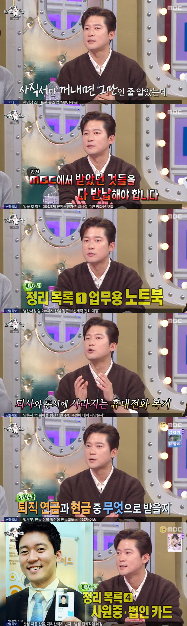 김대호는 퇴사를 결심하고서 회사에 의사를 밝히는 순간까지의 과정으로 "사직서만 내면 되는 줄 알았는데 MBC에서 받은 걸 다 반남해야 한다. 노트북 등 기기 점검을 하고 반납하고 휴대전화 보조금이 지원돼서 유심칩을 반납해야 한다. 퇴직금 받는 방식도 바로 받을지, 투자를 할 건지 정해야 하고, 사원증과 법인 카드도 반납한다"고 밝혔다.