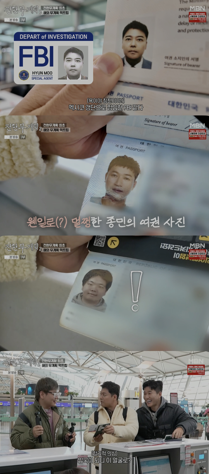 이날 탑승권 발급을 위한 신원 확인 중 세 사람의 여권 사진이 공개됐다. 김종민은 전현무의 사진을 보고서는 "갱단 같은데요. 멕시코"라고 했고, 곽튜브 역시 "멕시코 갱단으로 잠입한 FBI 같다"라고 거들었다.