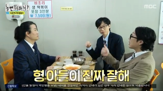 세 사람은 직장인 콘셉트로 진행된 이날 녹화를 위해, 단정하게 정장을 차려입고 등장했다. 이후 이른 아침부터 임우일이 소개하는 인천의 한 떡볶이 집에 도착했다.
