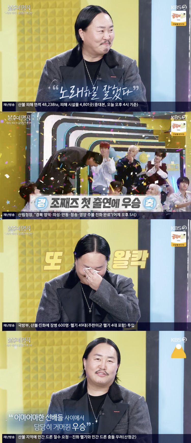 데뷔 3개월 만에 '불후의 명곡'에 출연해 1부 우승을 차지한 조째즈는 "엄청난 책임감도 느껴지고 정말 노래하길 잘했다(라는 생각이 든다)"라고 왈칵하며 눈물을 터뜨렸다.