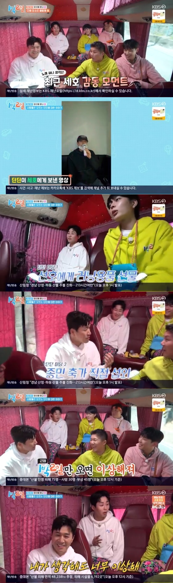 쏟아지는 미담에 웃음을 감추지 못하던 딘딘은 "그런데 '1박 2일' 촬영만 오면 이상해진다"는 멤버들의 폭로에 당황하는 모습을 보였다.