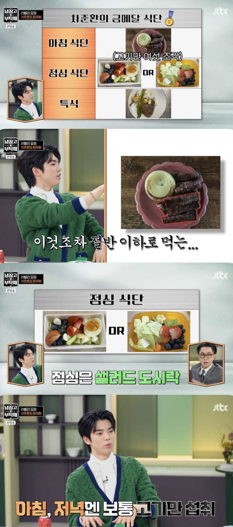 이어 차준환의 '금메달 식단'이 공개됐다. 한 눈에 봐도 적은 식사량. 그는 "아침에는 고기만 여섯 조각정도 먹는다. (사진의) 절반 이하로 먹는다. 아침 저녁은 보통 고기만 먹는다"라고 설명했다.