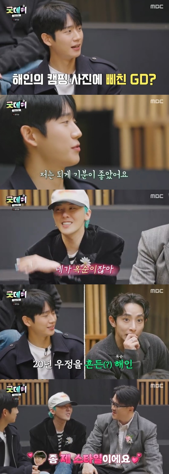 지드래곤은 "그래도 잘 갔다 왔으면 됐다"며 이해했다. 이에 정해인은 "지용이가 (캠핑) 기사 사진을 캡처해 보냈는데 저는 되게 기분이 좋았다. 어쨌든 관심을 갖고 보고 있다는 것 아니냐"고 고마움을 전했다.
