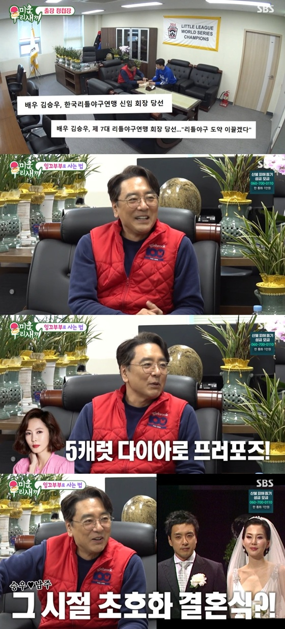 이날 김승우는 회장이 된 근황을 밝히며 "회장 역할이 아니다. 회장이 된 것"이라고 했다. 김승우는 현재 한국 리틀야구(유소년야구)연맹 회장을 맡고 있다. 이어 "우리 선수들이 3천 명 된다. 1녀 1남이지 않나. 1녀 3000남이 됐다. 아들이 3000명이다"라고 자랑했다.