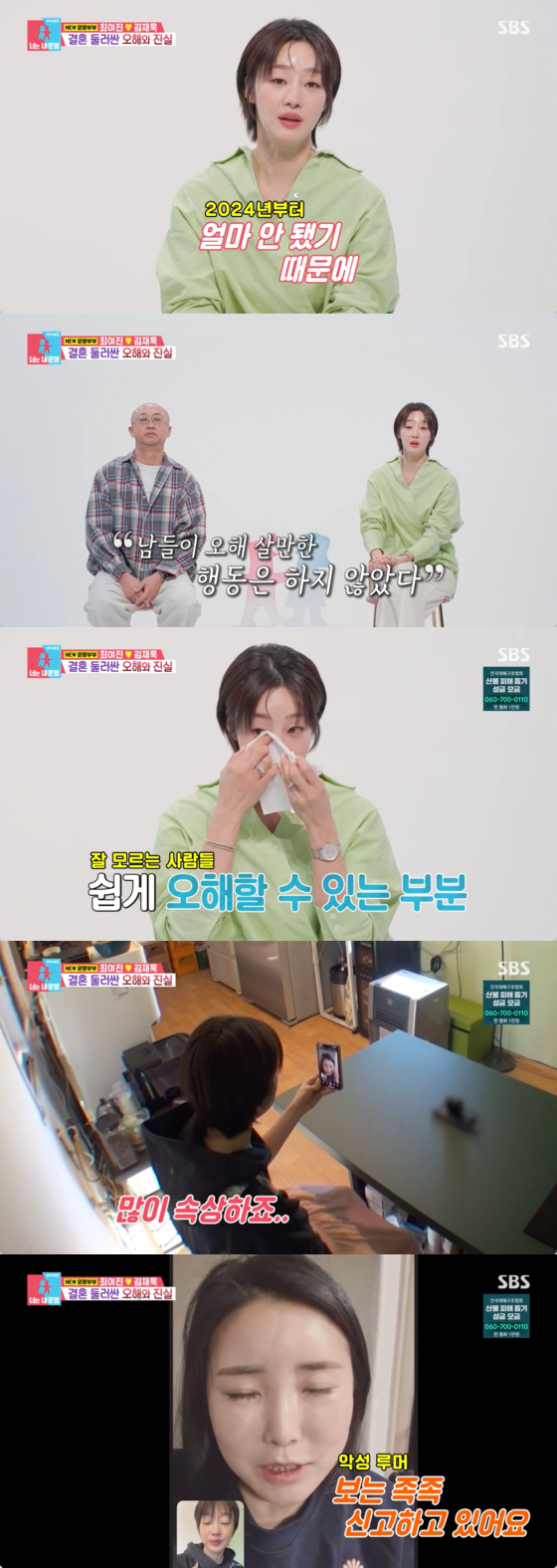 배우 최여진이 자신과 예비 남편 김재욱, 그의 전처를 둘러싼 불륜 의혹에 대해 해명하다 눈물을 쏟았다.