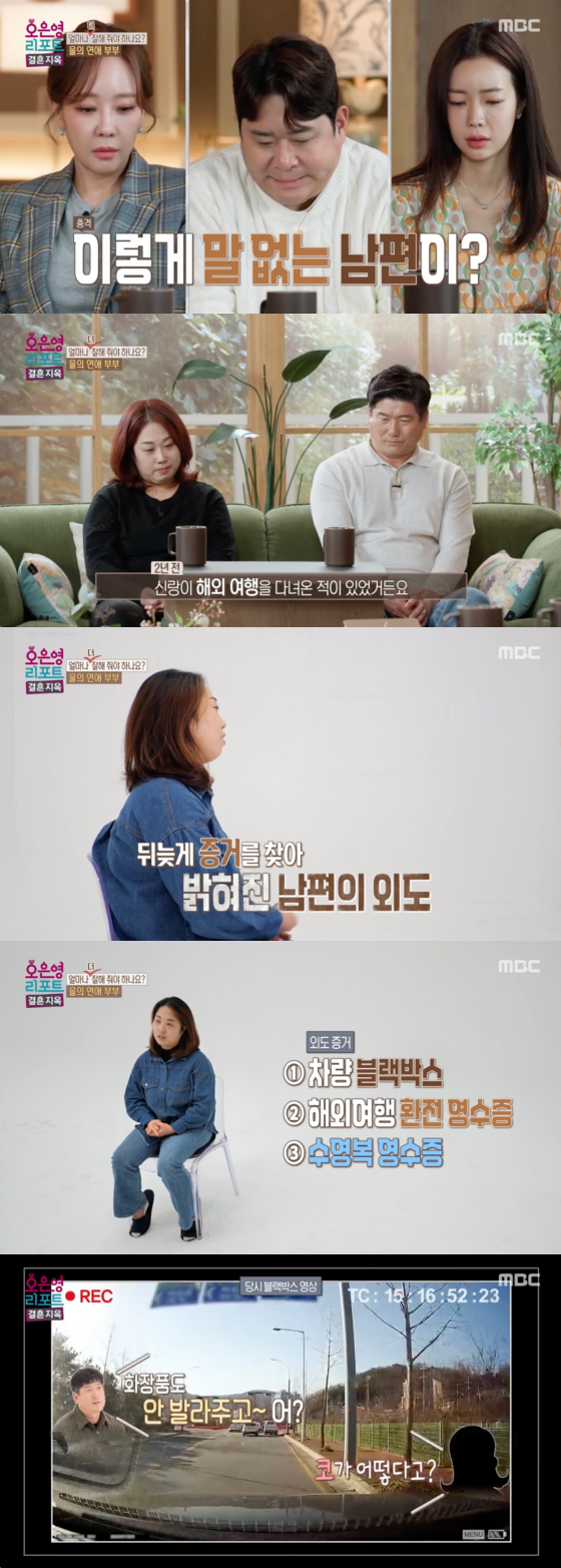 이날 아내는 "2년 전 남편이 외도를 한 적이 있다"고 말문을 열고는 "남편이 세부로 해외 여행을 가는데 누구와 어떻게 가는지 얘기를 안 하길래 내가 모든 증거를 다 찾았다"고 밝혔다.