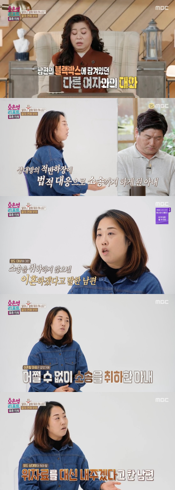 아내는 "내가 소송을 걸자 남편이 (외도 상대에 대한) 소송을 취하하지 않으면 이혼하겠다고 하더라. 나는 이혼 생각이 없었으니 그 소송을 취하했다"고 떠올렸다.