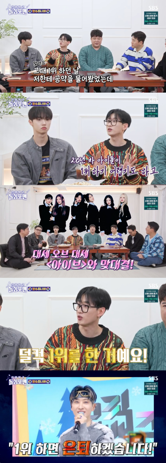 이어 "우리 연차가 1위를 하는 게 어렵기도 하고 (1위 경쟁 상대가) 그룹 아이브였다. 그래서 당연히 1위를 못할 거라고 생각하고 '1위 하면 은퇴하겠다'고 했는데 덜컥 1위를 했다"고 사건의 전말을 털어놨다.