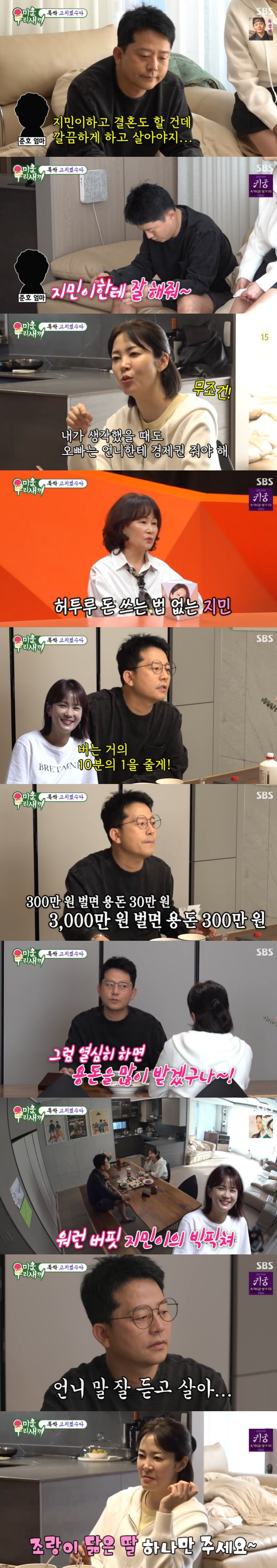 이 대화에 김지민 모친은 "경제권은 지민이가 갖고 있는 게 괜찮을 거 같다. 돈을 허투루 안 쓴다. 옛날엔 저축의 날이 있지 않았나. 그때 당시 지민이가 '대통령상'도 받았었다"라고 자랑했다.