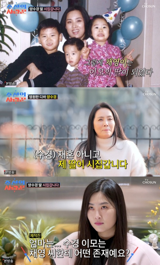 7일 오후 방송된 TV조선 예능프로그램 '조선의 사랑꾼'에서는 양수경이 조카이자 딸을 결혼시키며 애틋한 마음을 드러냈다.