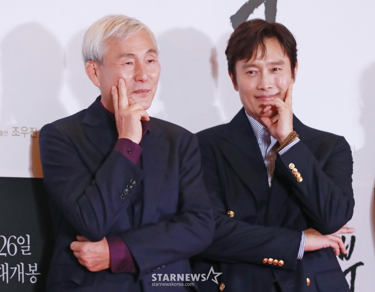 바둑기사 조훈현, 배우 이병헌이 19일 오후 서울 CGV용산아이파크몰에서 진행된 영화 '승부' VIP시사회에 참석해 포즈를 취하고 있다. /2025.03.19 /사진=이동훈 photoguy@