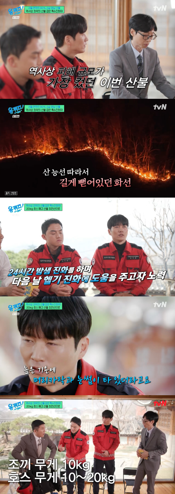 9일 방송된 tvN 예능 프로그램 '유 퀴즈 온 더 블럭'에는 사상 최대 규모 산불 현장에서 화마와 싸우며 국민을 지켜낸 산불재난특수진화대 김우영, 강민성 대원이 출연했다.