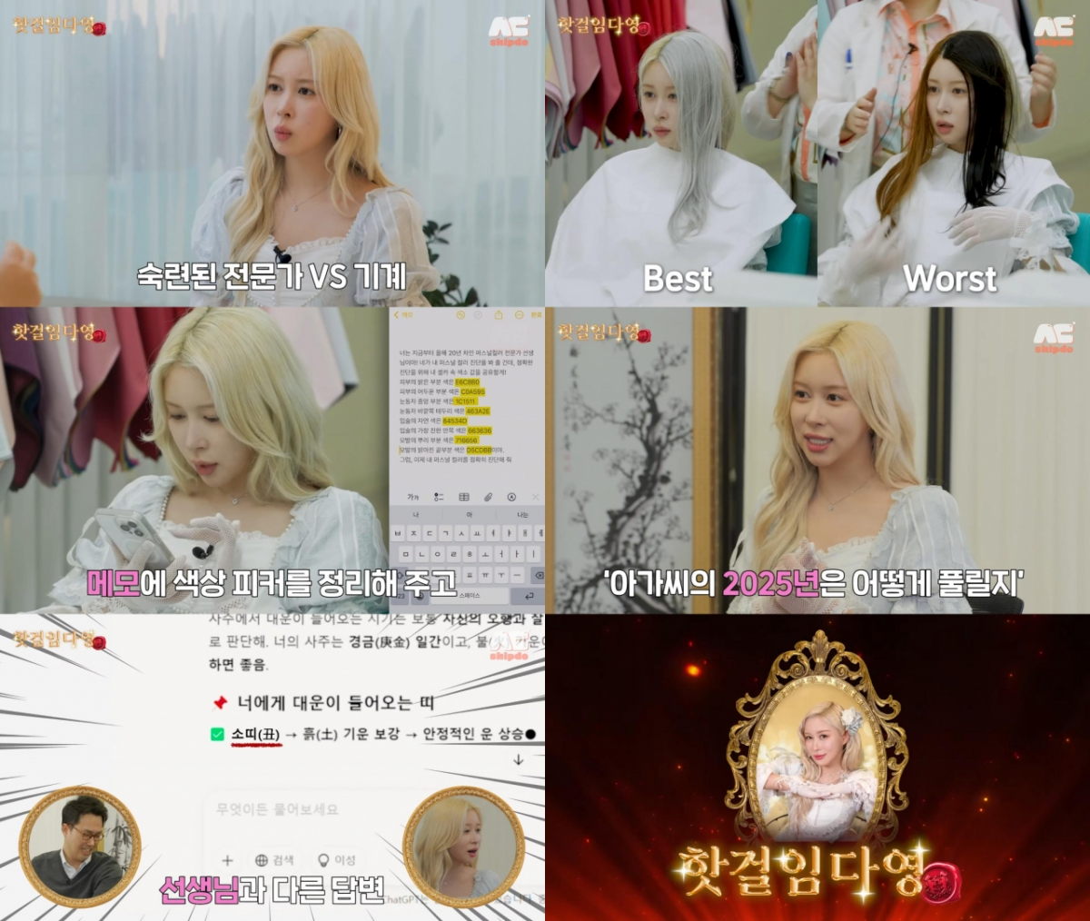 이어 2025년 운세에 대해서도 알아봤다. 역술가가 "2027년 말부터 2028년 대운이 들어오고, 특히 서양에서 좋은 반응이 있을 것"이라고 말하자 다영은 역대급 리액션을 보여주며 기뻐했고, 원숭이띠 해에 좋은 일이 생긴다는 말에 "차에 원숭이 소품을 가져다 놓자"는 반응으로 현장의 웃음을 유발했다. 그러나 챗GPT에서는 다영의 대운이 들어오는 띠를 소띠로 꼽으며 역술가와는 다른 답변을 냈고, 다영은 당혹감을 금치 못했다.