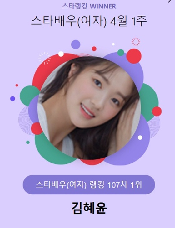 김혜윤은 지난 3일 오후 3시 1분부터 10일 오후 3시까지 진행된 4월 1주(107차) 스타랭킹 스타배우 여자 랭킹 투표에서 2만 294표를 획득하며 1위에 올랐다.
