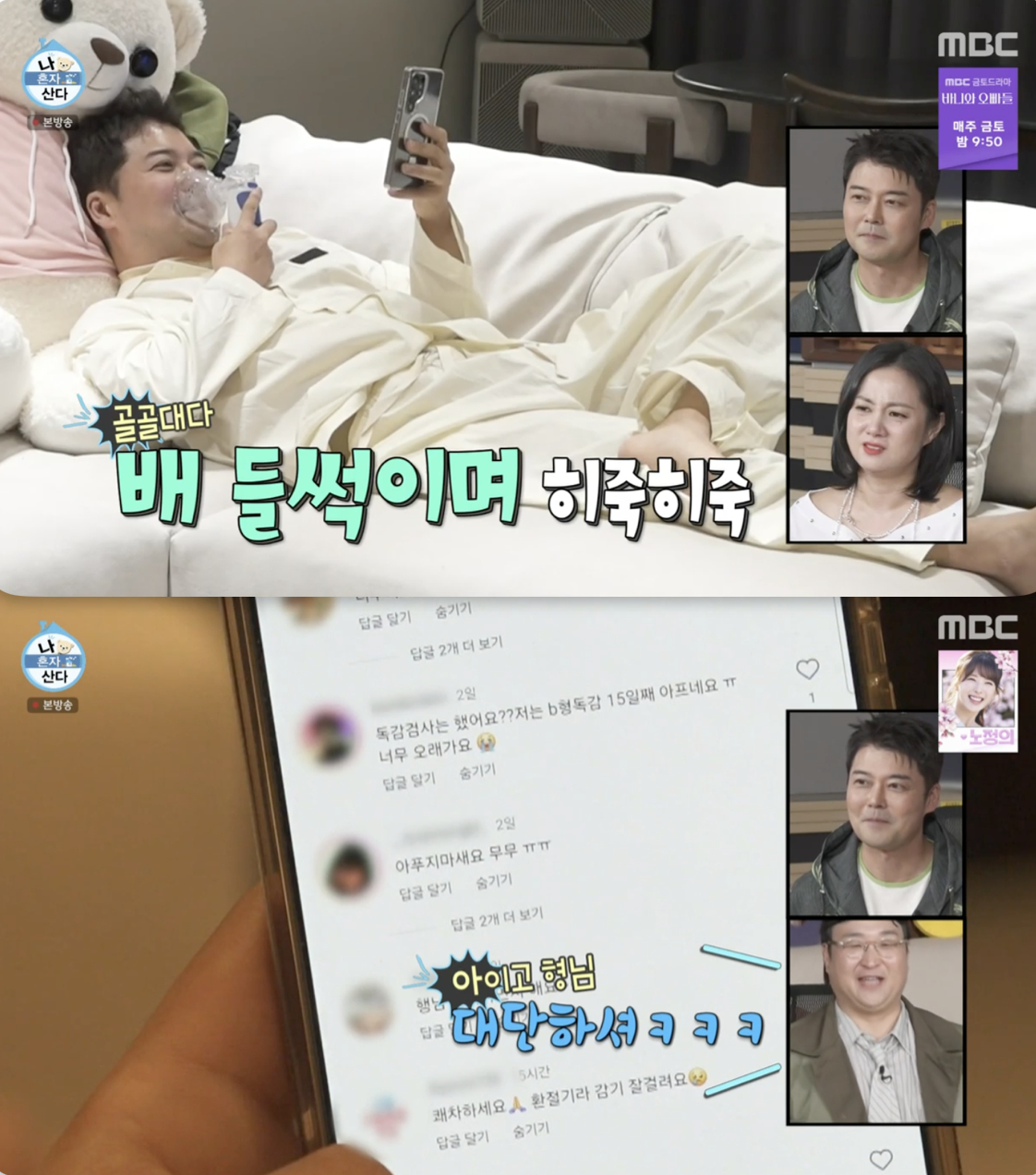 힘없이 누워 있던 그는 자신의 SNS에 달린 팬들의 댓글을 읽으며 배를 들썩이며 히죽이기 시작했다. 팬들의 따뜻한 댓글에 위로받는 모습을 보이며, 마음을 충전하는 듯한 표정을 지었다.