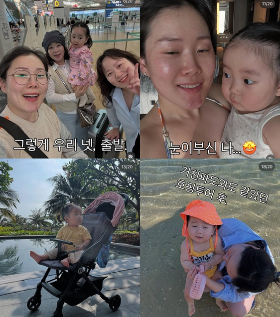 또 수영복을 입고 아이를 안은 채 눈을 반쯤 뜬 모습으로 "눈이부신 나"라고 글을 적어 웃음을 자아냈다. 그런가하면 리조트 안에서 아이를 안고 여유로운 모습을 보이거나 "거친파도와도 같았던 호핑투어 후"라는 글과 함께 수영복을 입고 아이를 바라보는 사진을 올리기도 했다.