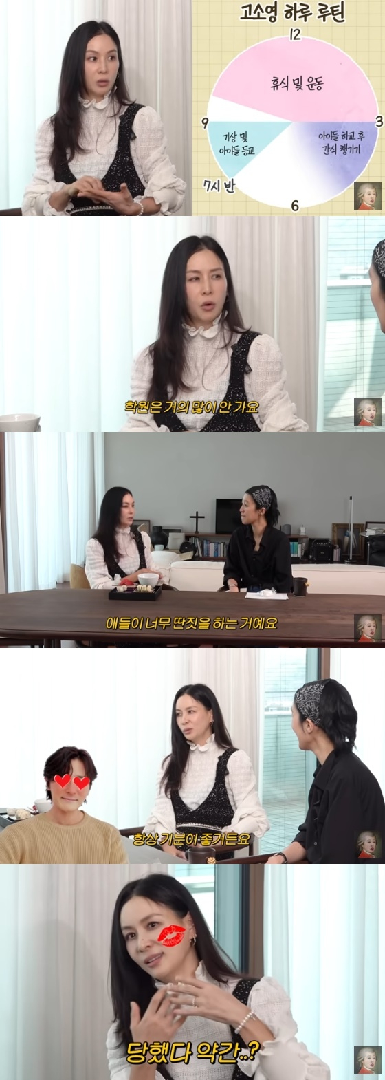 이날 고소영은 두 아이들과 지내는 하루 일과를 공개해 이목을 끌었다. 고소영은 "아침 7시 반에 일어나 아이들 학교를 보내고 조금 쉬다가 운동을 하거나 산책을 나간다. 아이들이 3시쯤 오면 간식을 챙겨준다"고 단순한 루틴을 공개했다.