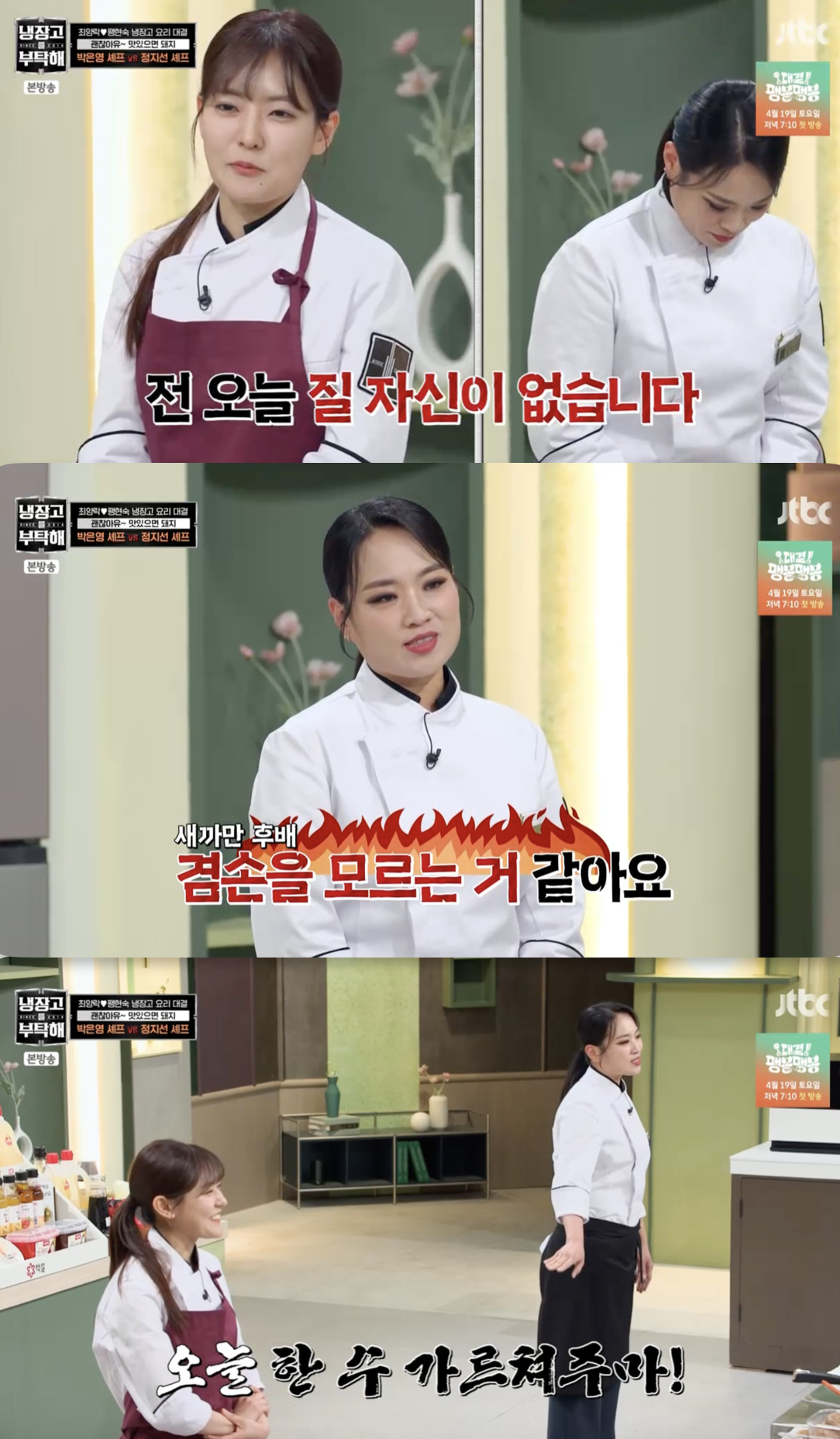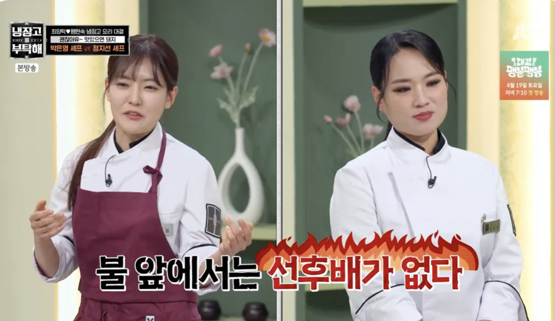 그러자 정지선은 "은영이랑 저는 8년 차이다. 겸손을 모르는 것 같다. 많이 눌러줘야겠다"고 기선제압에 나섰다. 하지만 박은영은 "불 앞에서는 선후배가 없다"라며 전혀 기죽지 않는 모습으로 물러서지 않고 맞서 보는 이들의 긴장감을 고조시켰다.