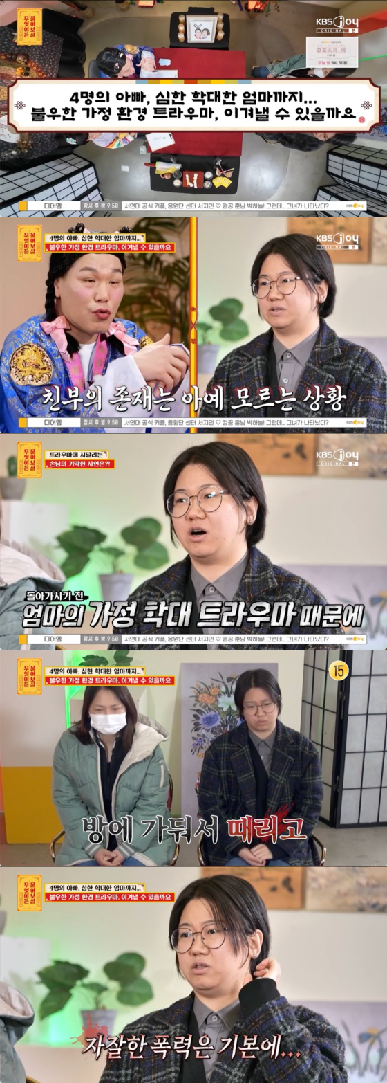 14일 방송된 KBS Joy 예능 프로그램 '무엇이든 물어보살'에는 계속되는 재혼과 지속적인 학대의 트라우마에서 벗어나고 싶다는 사연자가 이모와 함께 출연했다.