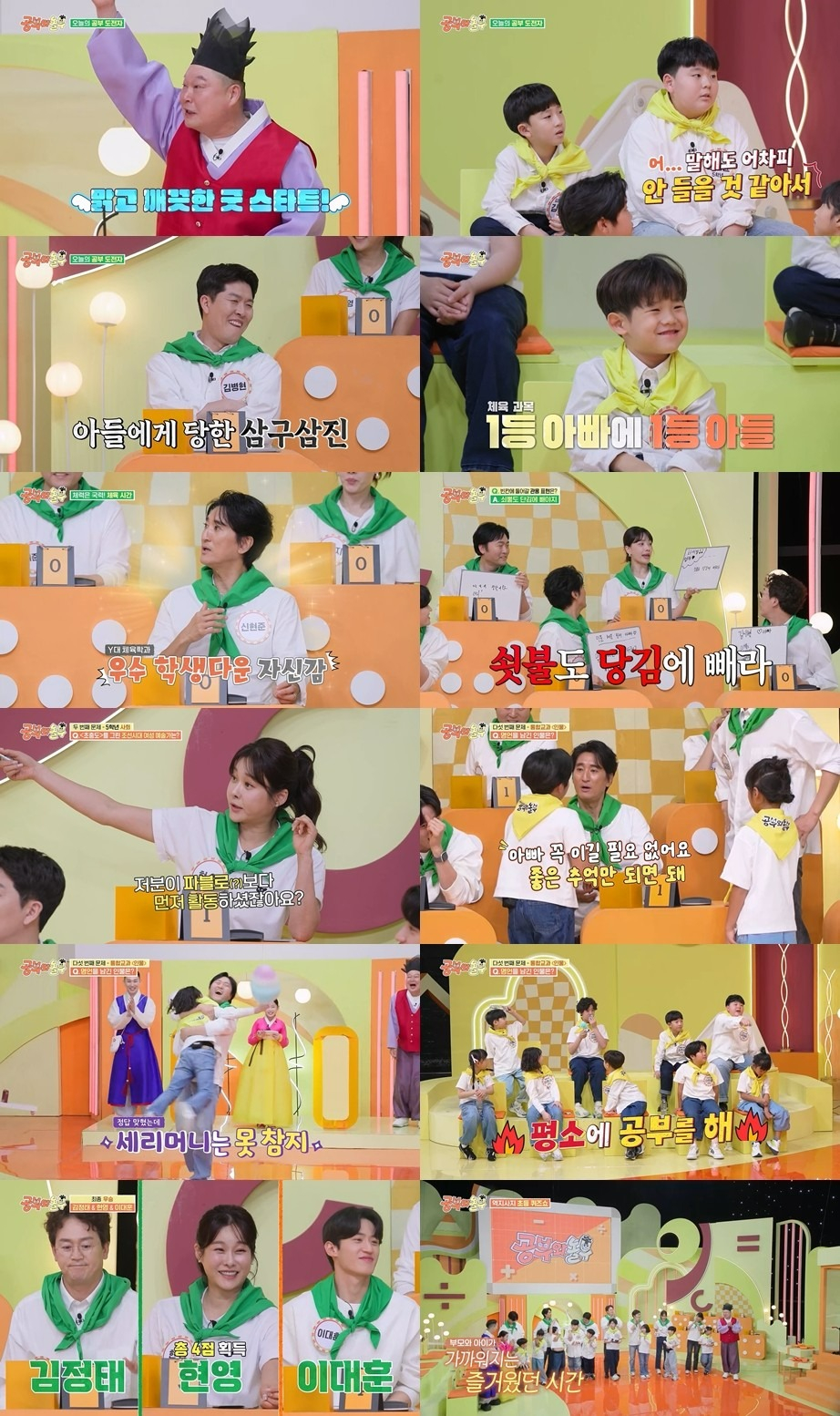 그런가 하면 '공부와 놀부'를 통해 상황이 역전된 부모와 자녀들의 모습이 시작부터 웃음을 유발했다. 문제 풀이 시작 전부터 신경전을 벌이느라 혈안이 된 부모석과는 달리, 그런 부모들의 모습을 의젓하게 바라보는 모습이 눈에 띈 것. 이에 신현준은 "원래 저쪽(애들 자리)이 더 점잖은 건가요?"라고 의아함을 드러내기도 했다. 특히 김병현은 아들 김태윤에게 팩폭을 당해 눈길을 끌었는데, 김태윤은 "아빠가 공부도 안 하고, 노력도 안 한다. 하라고 말도 안 했다. 말해도 안 들을 것 같았다"라고 호소하며, 말 안 듣는 아들을 키우는 부모의 심정에 빙의해 폭소를 안겼다. 그도 잠시, 김태윤은 몸풀기 시간에 '자녀를 등에 업고 팔굽혀펴기'를 하는 미션이 주어지자, 어깨 부상으로 은퇴한 아빠의 몸을 살뜰히 챙기며 숨길 수 없는 아빠 사랑으로 훈훈함을 자아냈다.