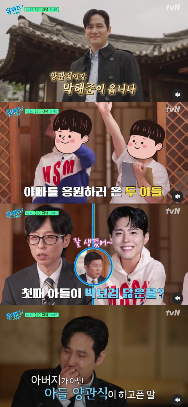 공개된 영상 속 박해준은 두 아들과 함께 '유 퀴즈 온 더 블럭' 촬영장에 방문했고, 유재석은 "첫째 아들이 박보검 씨를 닮기도 하고, 느낌이 이어진다"고 말해 눈길을 끌었다.