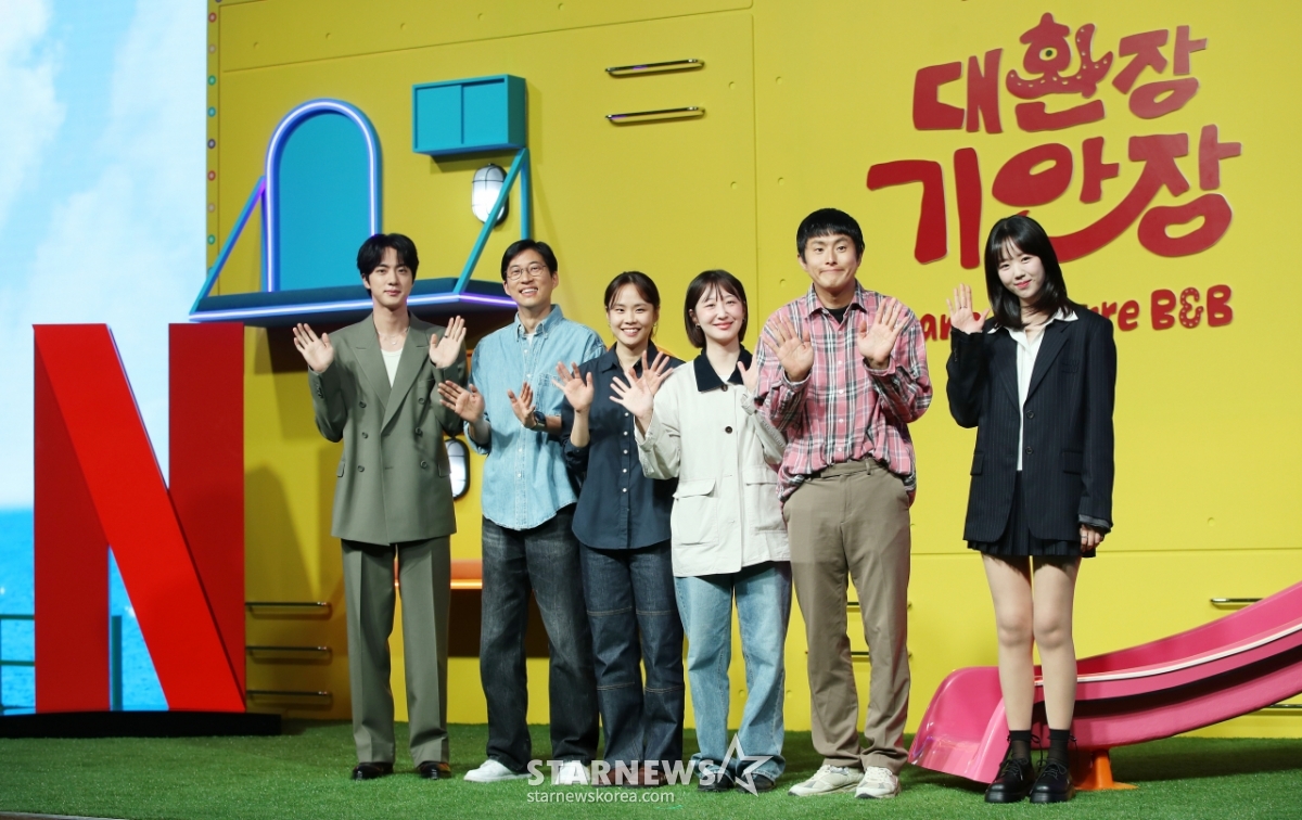 연예방송말 그대로 '대환장' 기안장[★포토]발행 : 2025.04.15 ・ 11:47김휘선 기자방탄소년단 진, 정효민 PD, 이소민 PD, 황윤서 PD, 방송인 기안84, 배우 지예은이 15일 오전 서울 종로구 JW매리어트 동대문에서 열린 넷플릭스 시리즈 새 예능 '대환장 기안장' 기자간담회에 참석해 포즈를 취하고 있다. /2025.04.15<저작권자 © 스타뉴스, 무단전재 및 재배포 금지>환장안장방탄소년단정효민이소민서울추천 기사김휘선 기자기자홈좋아요 연예-방송의 인기 급상승 뉴스연예-방송의 최신 뉴스