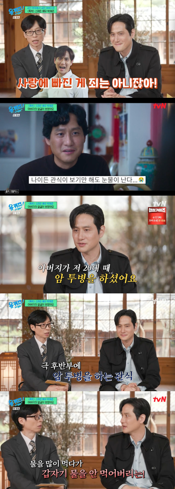 유재석이 "양관식과 학씨 중 어느 쪽에 가깝냐"고 묻자 박해준은 "굳이 말하자면 양관식에 가까운 편이다. '폭싹 속았수다'를 찍으며 아버지 생각이 많이 났다. 제가 20대 때 아버지가 암 투병을 하셨다. 극 후반부에 관식이가 암 투병을 하니까 역할을 위해 격투기 선수들이 계체량 할 때 하는 방법으로 체중을 감량했다. 물을 하나도 마시지 않은 상태에서 촬영한 것"이라고 설명했다.