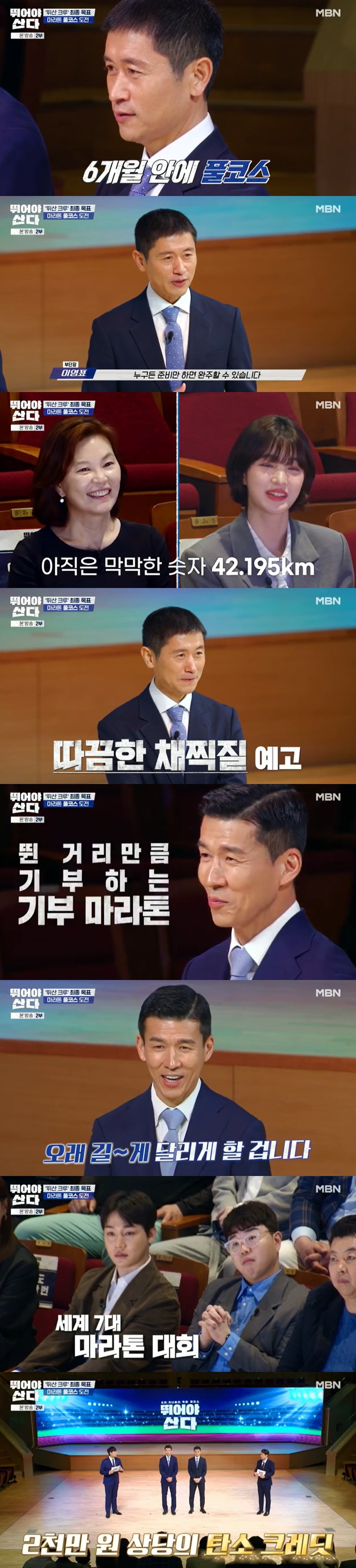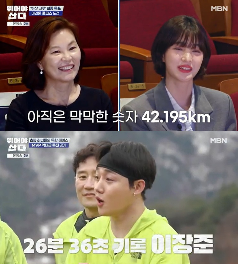 19일 첫 방송된 MBN '뛰어야 산다'에서는 저마다의 사연을 안고 러닝에 도전하는 비기너 15명이 등장했다. 이날 단장 션, 부단장 이영표, MC 배성재, 양세형과 함께 16인이 발대식을 가졌다.