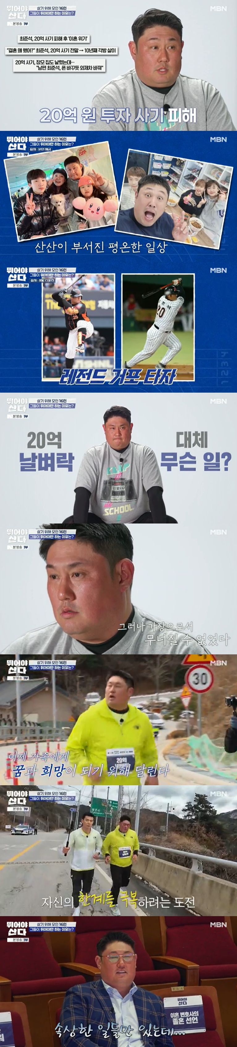 최준석은 "사실 은퇴하고서 달리기를 한 적이 없다. 뛰는 것 자체가 무모한 도전이라 생각한다. 그런데 포기 안 할 것 같다. 한번 해보자는 생각밖에 없다"라고 털어놨다. 양준혁은 "20억 날린 게 무슨 일이냐"라고 묻자 최준석은 "사연이 있다"라고 했고, 양준혁은 "형도 많이 날렸다. 동병상련이다. 앞으로 200억 땡기면 된다"라고 위로했다.