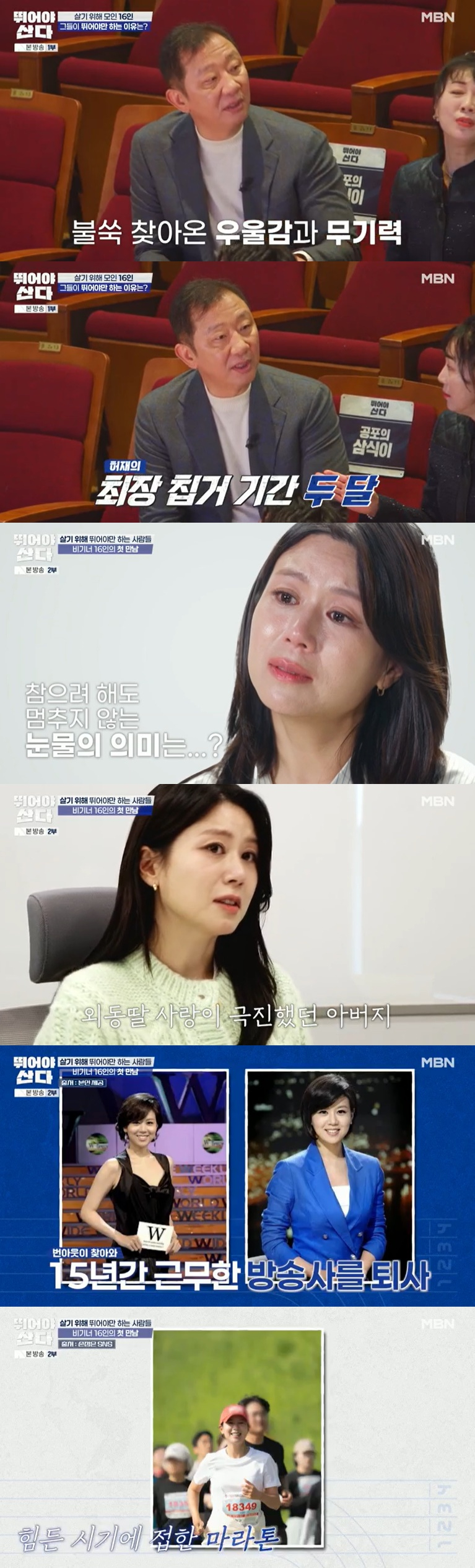 전 아나운서 손정은은 "6년 전에 아빠가 폐암으로 돌아가셨다. 2년 안에 빨리 돌아가시더라. 이듬해에 제가 이혼하게 됐다. 제 개인적으로 힘든 일을 겪으면서 번아웃이 왔다. 제가 할 수 있는 프로그램도 없을 것 같았다. 코너에 몰리니까 뭐라도 해야겠다 싶었는데 그때 마라톤을 했고 성취감이 장난 아니었다. 달리기를 하니까 몸과 마음이 건강해졌고 이제 그만 울고 행복해지고 싶다"라고 고백했다.